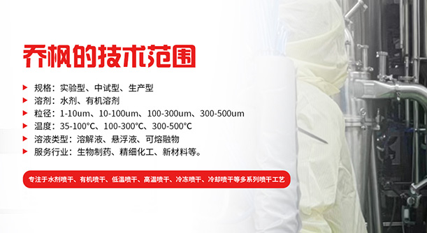 上海喬楓實業有限公司,成立于2012年,是從事噴霧干燥設備的研發設計、生產、銷售(小型噴霧干燥機,實驗型噴霧干燥機,35℃低溫噴霧干燥機,有機溶劑噴霧干燥機,低溫閉式循環噴霧干燥機、超細粉末噴霧干燥機、噴霧冷凍干燥機真空噴霧干燥機、氣流噴霧干燥機噴霧造粒干燥機,離心噴霧干燥機,沸騰制粒機等)和售后于一體的綜合性公司,本公司現成為一家致力于為生物制藥、精細化工、新能源、陶瓷造粒及食品工程等領域提供全套解決方案的整線交鑰匙工程企業。